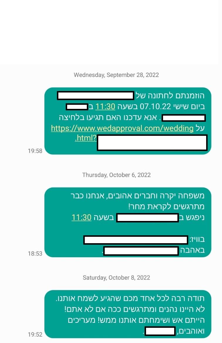 השירות היה מצוין, איפשרו לנו לשלוח גם בוואטסאפ בנוסף לסמס, זמינים לכל שאלה\בקשה והמחיר זול יחסית. ממליצים בחום!