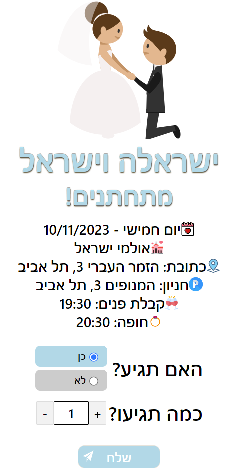 השירות שלהם היה מעל ומעבר. הם הסבירו לנו בדיוק איך הכל עובד, נתנו לנו את ההמלצות שלהם לגבי כמה פעמים כדאי לשלוח בקשה לאישורי הגעה למוזמנים.